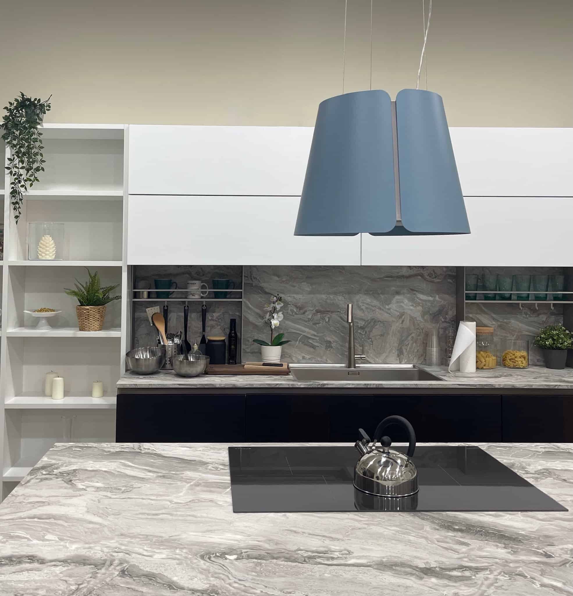 Bring colour into your kitchen design through appliances! Faber’s blue Beat is a wonderful hint of blue, perfect for a white or grey kitchen interior. Match your appliances to your interior or add pops of contrasting accent colours. The colour and design of this hood immediately creates a focal point for the space below. Pendant cooker hoods like this one look amazing above an island as they draw the eye to the island underneath, a wonderful spot to add a floral arrangement!